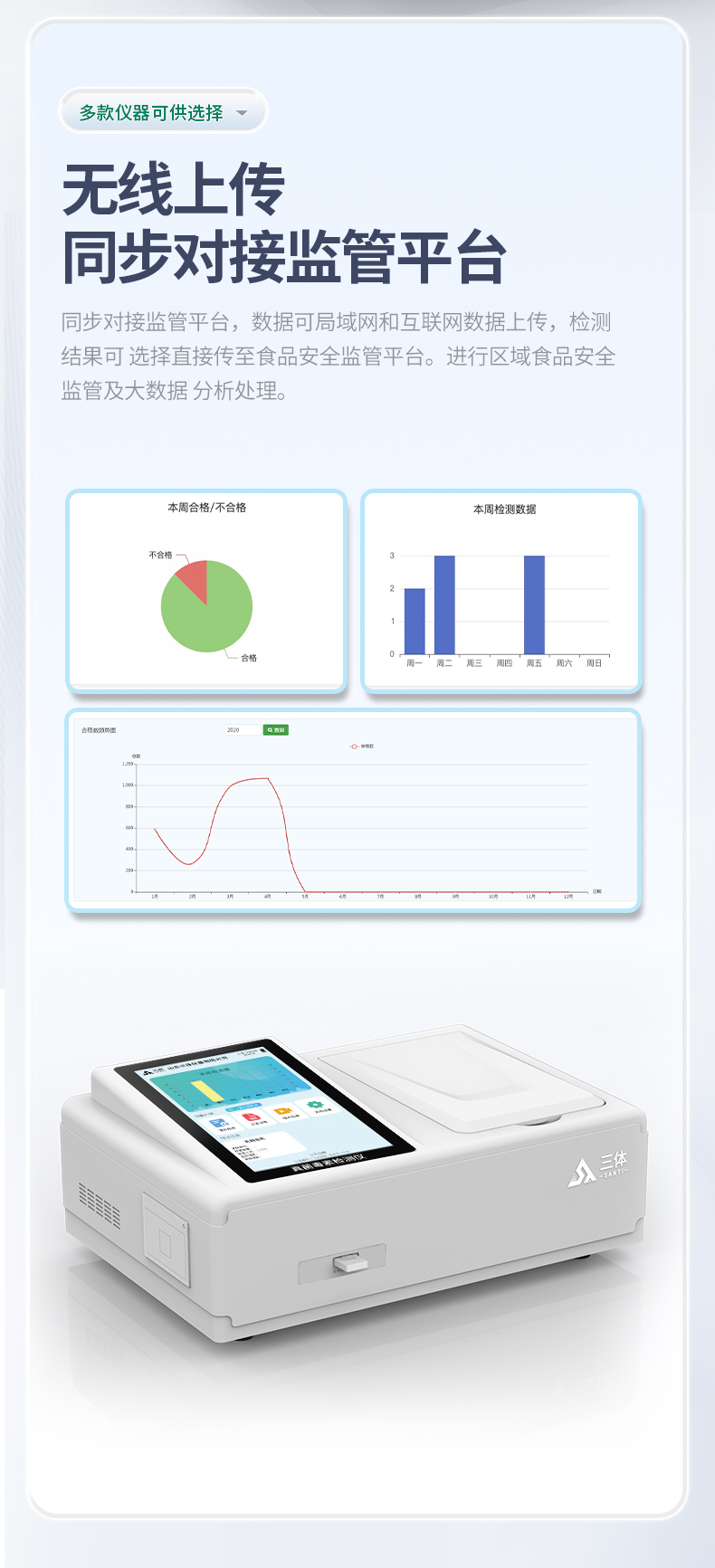 11、儀器具有 wifi 聯網上傳、RJ45網線連接功能,可以快速上傳數據。同步對接監管平臺,數據可局域網和互聯網數據上傳,檢測結果直接傳至食品安全監管平臺。進行區域食品安全監管及大數據分析處理與數據統計,檢測區域食品安全長短期動態,達到食品安全問題預估、預警。