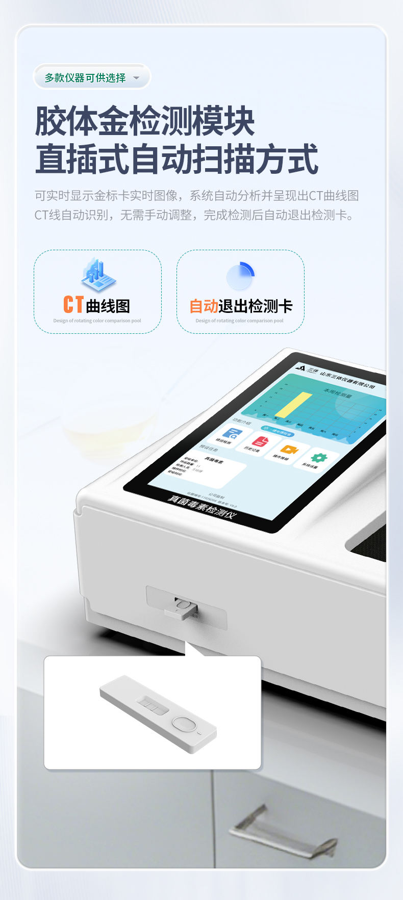 直插式自動掃描方式,可實時顯示金標卡實時圖像,系統自動分析并呈現出CT曲線圖,CT線自動識別,無需手動調整,完成檢測后自動退出檢測卡。