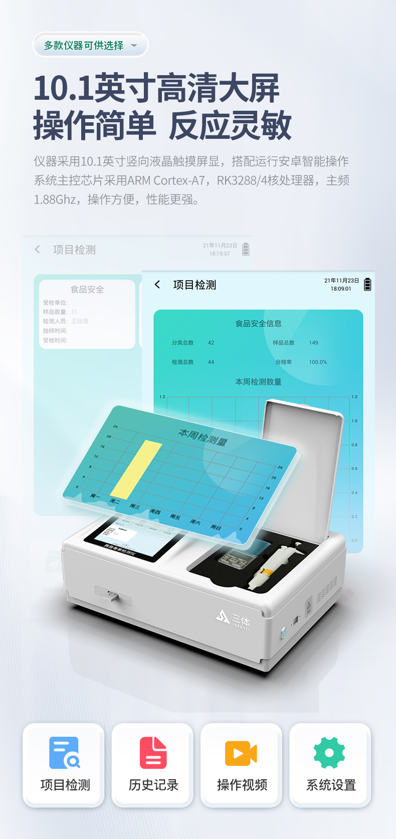 1、儀器采用10.1英寸液晶觸摸屏顯,搭配運行安卓智能操作系統,主控芯片采用ARM Cortex-A7,RK3288/4核處理器,主頻1.88Ghz,運轉速度更快速,性能更強。